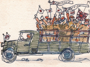 産業報國会の青年隊が整列して送って呉れた。午後からは床屋に行き丸坊主に刈り込んでもらう。床屋の主は自分に『應召ですか。?』『御苦労様です。髪の毛を少し採って置きましょう。』と少量を紙に包んでくれた。今夕は隣組の方や知り合いの人で送別会を、家でやってくれる事になっている。應召時には酒の特別配給がある。隣組の人達も多少持ち寄ったのか、特配より多い目にある。物質不足と言いながら割りと盛大にやって呉れた。日の丸の寄せ書きもまとまった。明朝入隊とあって早めにお開きとする。